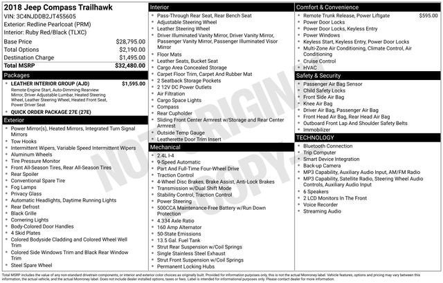 Discover the perfect balance of capability and comfort in the 2018 Jeep Compass Trailhawk. This striking red SUV boasts a powerful 2.4L I4 engine paired with a 9-Speed Automatic transmission and 4WD, delivering an impressive 22 MPG in the city and 30 MPG on the highway.- LOCAL TRADE**- LEATHER INTERIOR GROUP: 4-Way Power Lumbar Adjust, Leather Wrapped Steering Wheel, Remote Start System, Windshield Wiper De-Icer, Rear View Auto Dim Mirror, Heated Front Seats, Heated Steering Wheel, Power 8-Way Driver/Manual 6-Way Passenger Seats- POWER LIFTGATEElevate your driving experience with the Compass Trailhawk's standout features:- Auto-Dimming Rear-View Mirror- Heated Steering Wheel- Leather w/Perforated Insert Bucket Seats- Leather Wrapped Steering Wheel- Remote Start System- 4-Way Power Lumbar Adjust- Heated Front Seats- Power 8-Way Driver/Manual 6-Way Passenger Seats- Windshield Wiper De-IcerThis Jeep Compass Trailhawk is more than just a capable off-road companion; it's a refined and well-equipped SUV that will enhance your daily drives. The Uconnect 4 infotainment system with an 8.4 display, Apple CarPlay/Android Auto, and a premium audio system ensure you stay connected and entertained. Safety features like Brake Assist, Electronic Stability Control, and a ParkView Rear Back-Up Camera provide peace of mind.Whether you're navigating the city streets or tackling the trails, the 2018 Jeep Compass Trailhawk is ready to elevate your driving experience. With its impressive capabilities, premium amenities, and striking good looks, this Compass Trailhawk is a must-see. Visit our showroom today and let us demonstrate how this exceptional SUV can enhance your lifestyle.