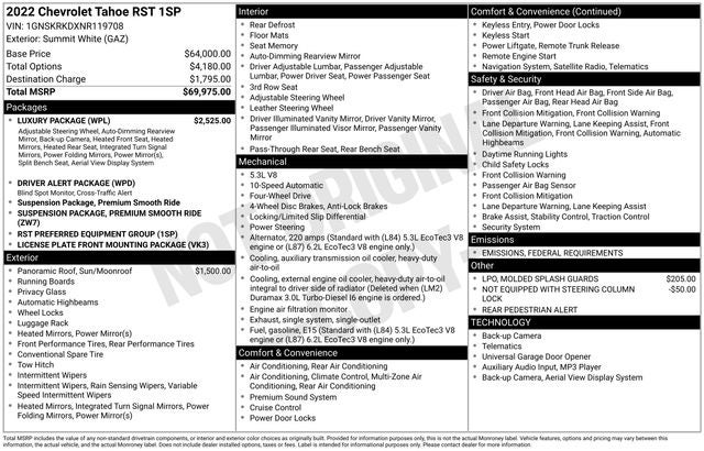 The Luxury Package on this Tahoe RST elevates the driving experience with features like a heated steering wheel, heated second-row seats, memory settings, and more. The panoramic sunroof provides an open and airy cabin, while the HD Surround Vision system and Rear Pedestrian Alert enhance safety and awareness on the road.
