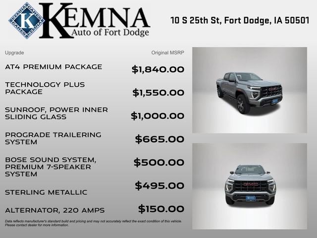 Discover the ultimate off-road companion in the 2023 GMC Canyon AT4. This rugged and capable truck is ready to take on any adventure, with a commanding presence and a host of premium features that elevate the driving experience.- Local Trade- One OwnerThe 2023 Canyon AT4 is equipped with a powerful 2.7L Turbo engine mated to an 8-speed automatic transmission, delivering exceptional performance and efficiency with 17 city/21 highway MPG. This 4WD truck is built to conquer the toughest terrain, thanks to its Prograde Trailering System, Automatic Locking Rear Differential, and a suite of advanced technologies that enhance towing, off-road capability, and safety.The AT4 Premium Package takes this truck to the next level, offering a host of premium features:- Wireless Charging- Heated Steering Wheel- Ventilated Front Seats- Bose Premium 7-Speaker Sound System- HD Surround Vision- Multicolor 6.3 Diagonal Head-Up DisplayThe Canyon Safety Plus Package further enhances your confidence on the road, with features like Adaptive Cruise Control, Rear Pedestrian Alert, and Blind Zone Steering Assist.Step inside the 2023 Canyon AT4 and experience the perfect blend of ruggedness and refinement. The Jet Black/Timber perforated leather-appointed seating surfaces provide exceptional comfort, while the wireless Apple CarPlay and Android Auto integration keep you connected and entertained. The power-adjustable driver's seat with memory recall ensures you'll always find your perfect driving position.Whether you're tackling the great outdoors or navigating the daily commute, the 2023 GMC Canyon AT4 is the ultimate companion. With its impressive capabilities, premium features, and striking good looks, this truck is sure to turn heads and inspire confidence on any journey.Experience the 2023 GMC Canyon AT4 for yourself. Contact us today to schedule a test drive and discover the true meaning of off-road excellence.