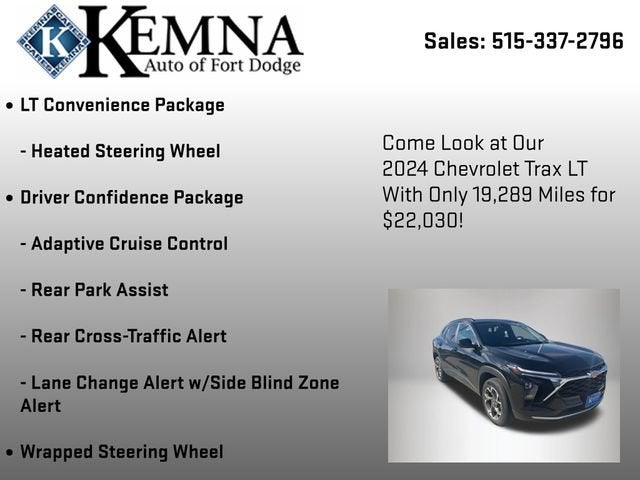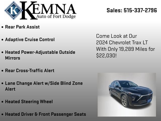 Discover the perfect balance of style, technology, and capability with the 2024 Chevrolet Trax LT. This sleek and versatile SUV is ready to elevate your driving experience, offering a dynamic blend of features that cater to your every need.- ONE OWNER**- LOCAL TRADE**- LT CONVENIENCE PACKAGE (Includes Keyless Open, Heated Driver and Front Passenger Seats, Heated Steering Wheel, Wrapped Steering Wheel, and Heated Power-Adjustable Outside Mirrors)- DRIVER CONFIDENCE PACKAGE (Includes Adaptive Cruise Control, Lane Change Alert with Side Blind Zone Alert, Rear Cross-Traffic Alert, and Rear Park Assist)- Preferred Equipment Group 1LTStep into the sophisticated cabin of the Trax LT and be captivated by the premium features that surround you. The heated steering wheel and heated front seats provide unparalleled comfort, while the Keyless Open feature ensures convenient access to your vehicle. The Lane Change Alert with Side Blind Zone Alert and Rear Cross-Traffic Alert keep you aware of your surroundings, while the Rear Park Assist helps you navigate tight spaces with ease.Beneath the sleek exterior lies a dynamic powertrain that delivers an impressive blend of performance and efficiency. The 1.2L Ecotec Turbo DOHC DI engine, paired with a 6-Speed Automatic transmission, provides a seamless and responsive driving experience, with an EPA-estimated 28 MPG in the city and 32 MPG on the highway.Versatility is at the heart of the Trax LT, with a spacious interior that can adapt to your ever-changing needs. The split-folding rear seats and ample cargo space allow you to easily accommodate your gear, whether you're embarking on a weekend adventure or tackling your daily commute.Safety is also a top priority in the Trax LT, with a comprehensive suite of advanced safety features. Dual front impact airbags, dual front side impact airbags, and an overhead airbag provide protection in the event of a collision, while the 4-Wheel Disc Brakes and Electronic Stability Control help you maintain control in challenging driving conditions.Experience the exceptional value and uncompromising quality of the 2024 Chevrolet Trax LT. Visit our showroom today and let us demonstrate how this versatile SUV can enhance your driving experience and exceed your expectations.
