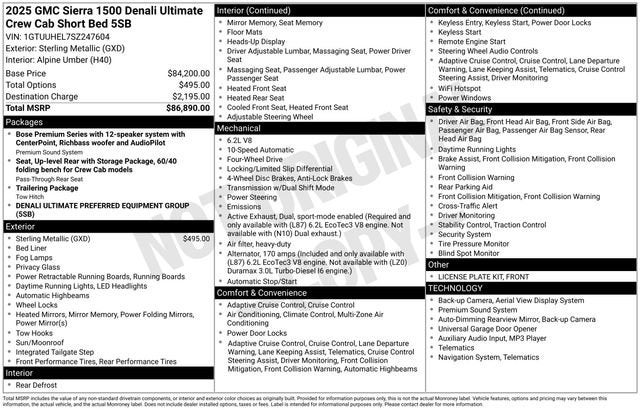 Elevate Your Driving Experience with the 2025 GMC Sierra 1500 Denali UltimateDiscover the epitome of power, sophistication, and uncompromising capability with the 2025 GMC Sierra 1500 Denali Ultimate. This exceptional full-size pickup is a true testament to GMC's engineering prowess, designed to exceed your every expectation.- ONE OWNER**- LOCAL TRADE**- Sterling Metallic- Trailering PackageIndulge in the unparalleled comfort and convenience of features such as the power moonroof, heated steering wheel, and the advanced Bose Premium Series audio system with 12 speakers. The Denali Ultimate also boasts a host of advanced safety technologies, including Rear Cross Traffic Braking, Rear Pedestrian Detection, and Ultrasonic Front & Rear Park Assist, ensuring you and your loved ones travel with complete peace of mind.Step inside the cabin and be enveloped in the luxurious ambiance of the full-grain leather seating, with both the driver and front passenger enjoying 16-way power adjustability and ventilation. The heated rear seats and the MultiPro Tailgate Audio System by Kicker further elevate the overall driving experience.Unleash the power of the EcoTec3 6.2L V8 engine, paired with a responsive 10-speed automatic transmission and the confidence of 4-wheel drive. Whether you're towing a heavy load or navigating the open road, this Sierra Denali Ultimate delivers a driving experience that is both exhilarating and effortless.Elevate your commute, conquer the great outdoors, or embark on your next adventure – the 2025 GMC Sierra 1500 Denali Ultimate is the ultimate companion for those who demand the very best. Experience the difference that true craftsmanship and attention to detail can make. Visit our showroom today and let us demonstrate how this exceptional vehicle can transform your driving experience.